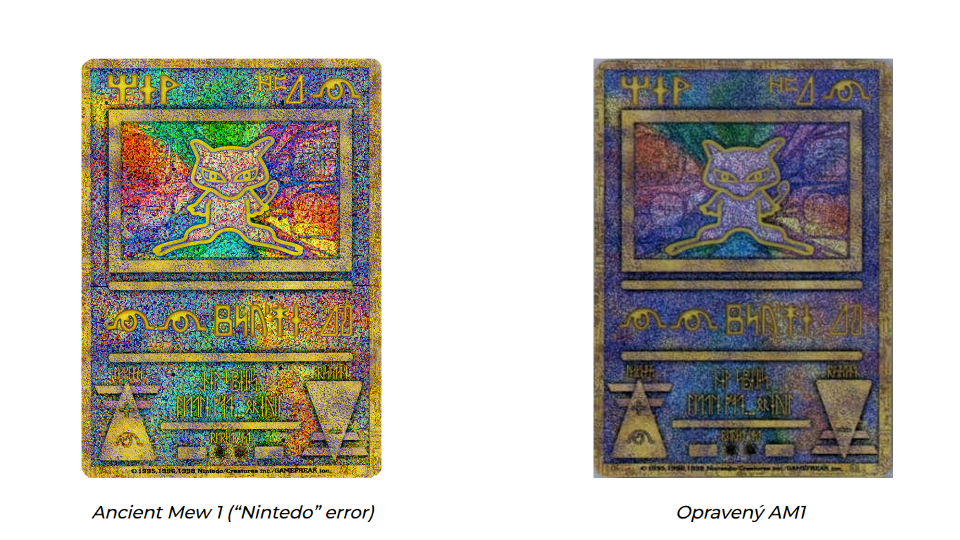 A teď to nejzajímavější: v dolní části karty je chyba – místo „Nintendo“ je napsáno „Nintedo“. Díky této chybě se Ancient Mew 1 stal sběratelským pokladem. Následně vyšla opravená verze.