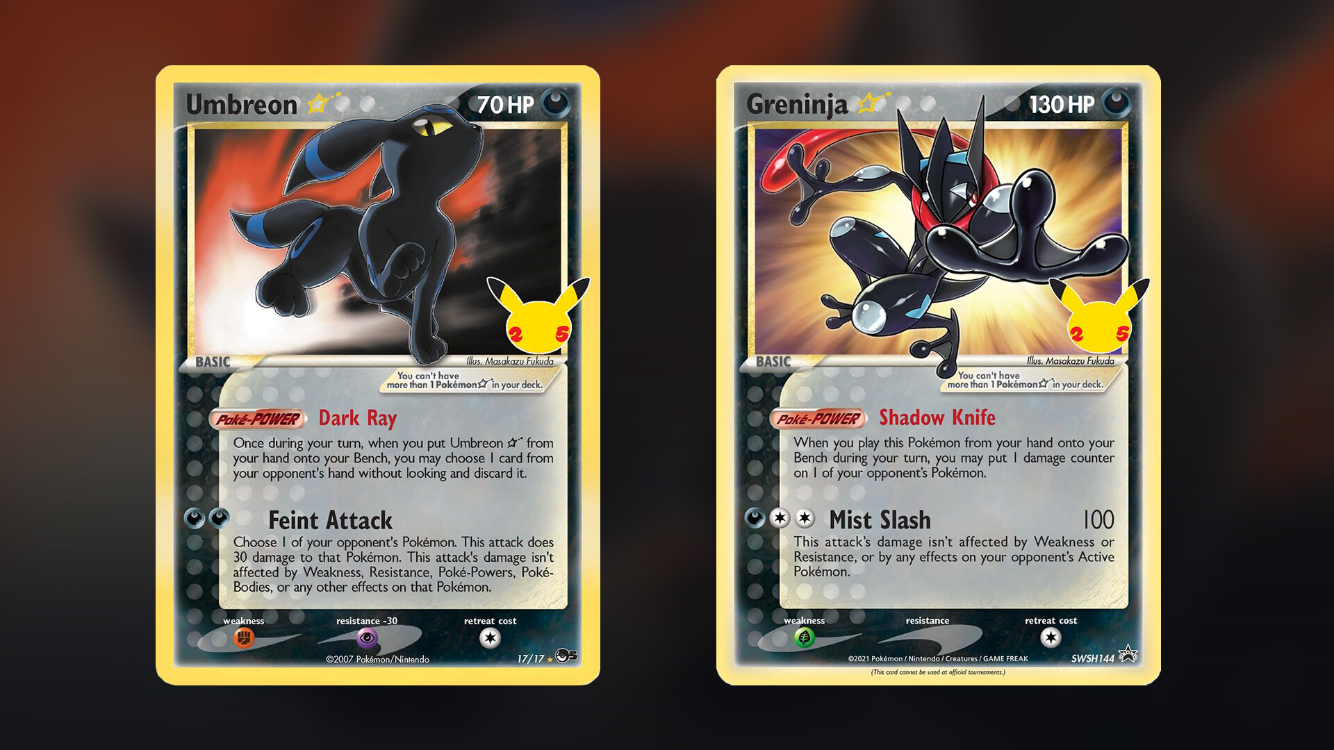 Goldstar karty vydané k 25. výročí Reprint Goldstar Umbreon a Goldstar Greninja promo